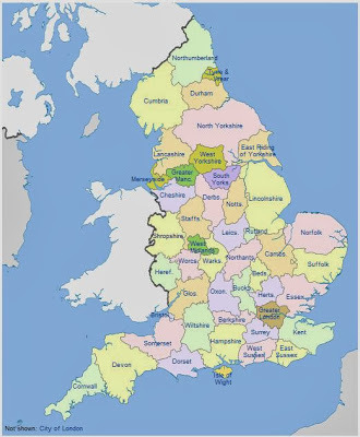 On the map that I am showing, space does not permit the spelling out of all the counties/shires, therefore this additional gloss. Read North to South and West to East. Clicking the map will enlarge it.