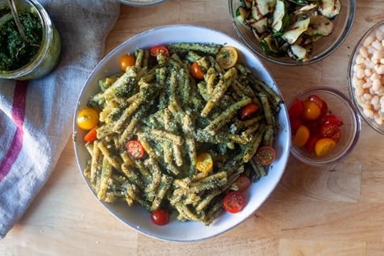 Welcome to the point of the summer when I don’t remember why I chose a career in cooking when I only want to eat about five things — tomatoes, melon, iced coffee and/or drinks, and popsicles — until the heat and humidity recede. The fifth, pasta with homemade basil pesto, is a craving that arrives like clockwork every July. It usually comes with very specific instructions, a list of everything I think tastes good with, near, or stirred into pesto pasta, things like white beans, grilled and marinated zucchini, halved cherry tomatoes, and bocconcini (or tinier!) mozzarella. And that’s it, that’s my whole menu for the rest of July. I’ll come back when I’m interesting again, okay?