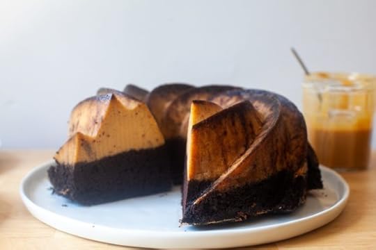 If you spend any time on Pinterest or Instagram food searches, and who that hangs out here does not, I bet at least once in the last couple years, your Explore tab led you to the photogenic, decadent world of chocoflans. If not, let this post fix your suggestions right now. Chocoflans, sometimes called impossible flan (pastel imposible), are one part flan (a sweetened egg custard with caramel or dulce de leche) and one part plush chocolate cake. They’re considered a bit magical, not only because they combine two of the most wonderful desserts in the world, but because of what happens in the oven. Even though it goes into the oven with the cake batter in first and the flan in second, as it bakes, the batters flip. Once you invert it out of the baking pan, you end up with the flan on top and the cake underneath. I’ve read that this is because the cake, as it rises in the oven, becomes lighter than the flan layer, so the flan sinks and I, a non-scientist, based on little more than liking the sound of it, have concluded that it makes total sense.