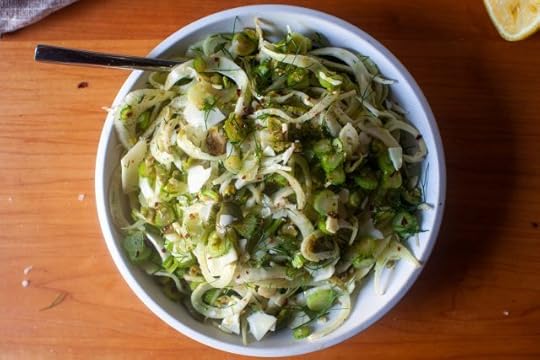 Last week I childishly pouted that nobody really loves fennel salads and so many of you commented that you wanted one, I am delighted I’ve been given the external validation I require to share a new one here. This fennel salad is from Café Altro Paradiso, which shares a chef — Ignacio Mattos — with two other New York restaurants, estela and Flora Bar. What I love about the cooking at these restaurants is that there’s a quiet minimalism to each dish that belies the actual complexity of flavors. It’s particularly evident in salads. At estela, my favorite is this endive salad, which seems like the most plain pile of lettuce until you find the heap of loudly flavored texture and crunch below, for scooping onto the leaves. This fennel salad looks equally unassuming when it comes out: a mountain of shaved bulb. But it sits on a piquant medley of crushed olives, thinly sliced stems, minced fronds, sharp cheese, citrus zest, juice, wine vinegar, olive oil, and seasoning that I’m not sure I ever want to stop eating.