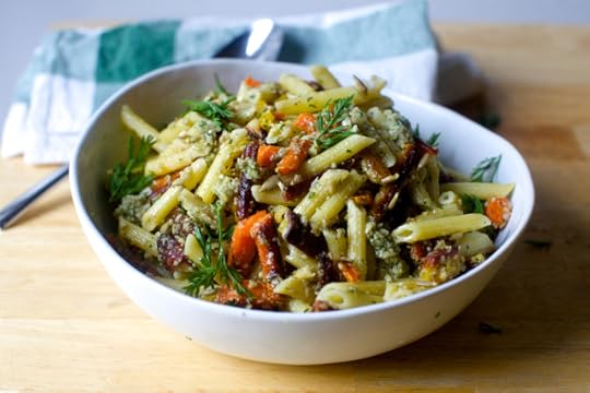 pasta salad with roasted carrots and sunflower seed dressing
