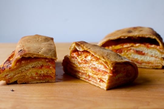 This is not a stromboli. If we’ve spoken in the last day, I’ve demanded that you weigh on a name for this dish. Pizza Streudel? Thousand-Layer Stromboli? Stromboli Babka? But that’s not where it began. It began as a dish called Scaccia Ragusana, which I found in an old Saveur issue. This stuffed flatbread is a Sicilian specialty from the province of Ragusa, made with a very thin rectangular layer of dough that’s folded in on itself a few times to make a veritable mille-feuille of a pie, with a dozen stunning layers greeting you when you, lucky you, cut into it. Not all scaccias have these thin folded layers; usually only the tomato and cheese ones do, while others have fillings from ricotta and fried eggplant, ricotta and sausage, greens, beans and more, folded over and crimped at the edges, sometimes elaborately with a braid, like a giant empanada.