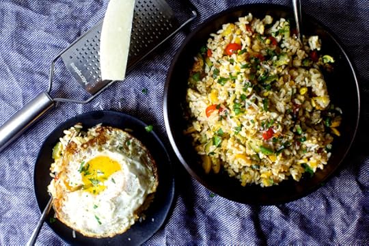 Hailing from East, Southeast and South Asian cuisine, it has absolutely nothing to do with the vague Italian/Mediterranean terroir of these ingredients, but I have for almost as many years as I’ve made Zucchini, Tomato and Rice Gratin (from a 2008 Gourmet Magazine, so: many) wished it could be a kind of wildly inauthentic Italian fried rice too. The original dish is a bit bit fussy as written — two baking sheets, one pot in which to cook the rice, saute pan for the onions and more, followed by a baking dish for the assembled gratin — and while the rewards for this effort are great, the level of effort ensures I make it approximately once every two years, a shame when all of the ingredients are so readily available in August.
