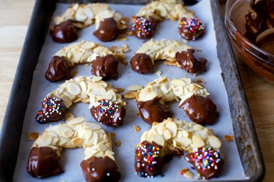 The only thing my mother ever asked me to bring home from the bakery where I worked in high school where almond horn cookies, or Mandelhörnchen, probably no surprise as we are a family of established marzipan fiends, most especially when dark chocolate is also involved. Chewy at the center with crunchy edges, the best ones are dipped in chocolate and while I have yet to see them also with rainbow sprinkles, I say there’s no time like the present to make this a Thing.