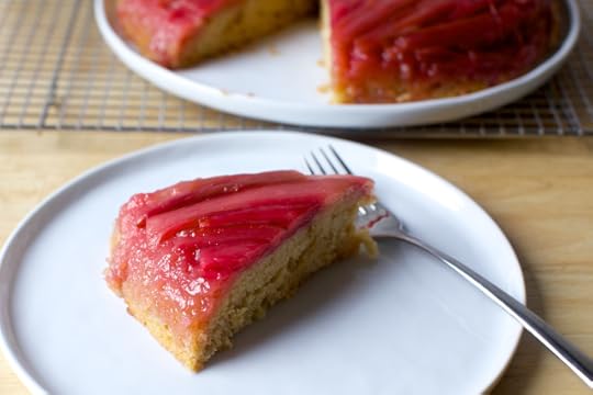 I realize that spring is supposed to be all flowers and pastels, lightness and lemon zest, but all of these cool, rainy days in the last month make me crave winter spices, no matter how many tomatoes and herbs I have planted this week (so many, eee) in hopes, despite all historical evidence, that this is the year I excel at container gardening. And so when a teacher at my son’s school brought me a bag of the most gorgeous, deeply red rhubarb (I really am this lucky), I knew immediately that this cake would have buttery, lightly caramelized stripe-y rhubarb topping draped over it. If you’re ever asking yourself if it’s been too long since you had an upside-down cake, the answer is always yes.