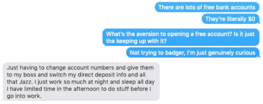 Finally, I asked him – why? Is it the psychological toll of having multiple accounts? Too much trouble to set up or switch auto-payments? Why keep a bank that charges fees when there are multiple free options?