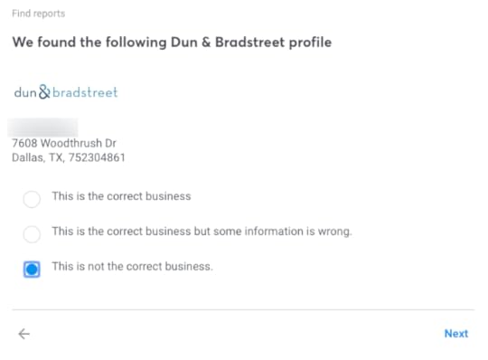 But with Dun & Bradstreet, I couldn’t find my business anywhere. I saw lots of others with similar names, and they showed me dozens of addresses – but none of them were mine.