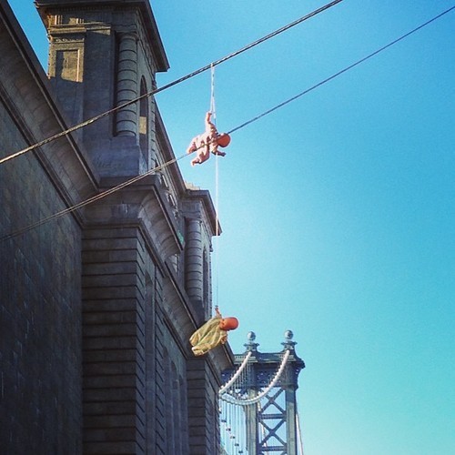 Creepy dolls hanging on a wire in #Brooklyn. View of Manhattan Bridge in background. #NYC (at The Archway Under the Manhattan Bridge)