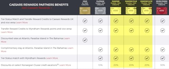 And when you go to Caesars casinos, you can skip most lines – and you never pay resort fees. In places like Las Vegas, that can save you a ton of time and money. Plus, if you like Wyndham hotels, you can match your status to top-tier elite status with them.