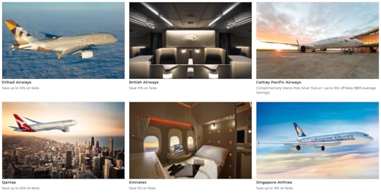1. TravelAirlinesBritish Airways – Up to 10% off most fares between the US/Canada and the UK (this is also a perk of the Chase British Airways card)Cathay Pacific – 5 to 15% off flights and Marco Polo Club Silver elite statusEmirates – 5% off fares from the USEtihad – Up to 10% off coach and Business class fares for certain destinations departing the USQantas – Up to 25% off fares between the US and Australia/NZ, depending on flight directionSingapore Airlines – Up to 15% off select flights from the USSurf Air – Round-trip trial flight for $650 and two round-trip guest flights when buy an All-You-Can-Fly membershipUnited – Up to 6% off select flights booked directly through United.com