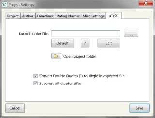 In yWriter5, click the Project menu, then Project Settings. This is where you enter the title of your novel, the author's name, and various other novel-specific values like deadline dates. Click the LaTeX tab and you'll see the following: