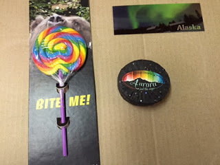 Treat Box (new photo when everything arrives): "Bite Me" lolly pop, handmade Aurora soap, Aurora motion bookmark, vampire button, chocolate, and other goodies.
