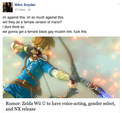 I’m just wondering why this guy is so against gender select, it’s not like he’s being made to play as female Link; why does it bother him that other people are able to lmfao