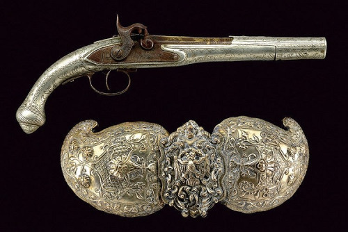 Silver mounted percussion pistol with matching belt buckle holster, originates from the Balkans, mid 19th century.