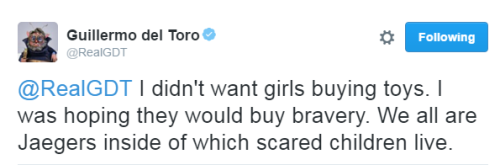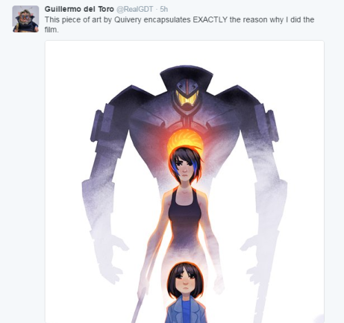 [Two tweets from Guillermo del Toro: This piece of art by Quivery encapsulates EXACTLY the reason why I did the film. I didn’t want girls buying toys. I was hoping they would buy bravery. We all are Jaegers inside of which scared children live.] (source)