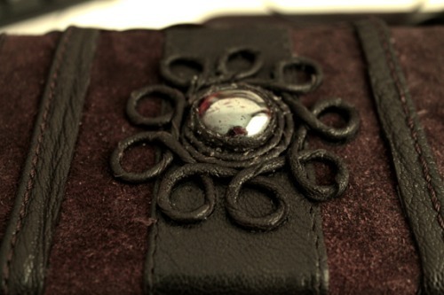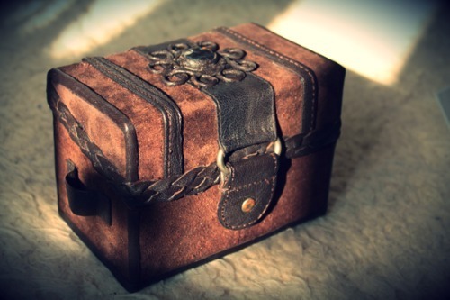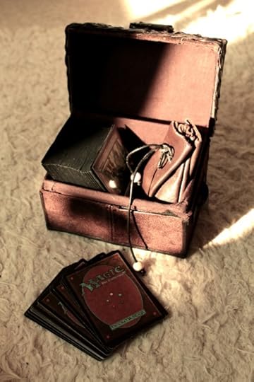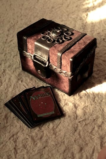 Hard paper box ornamented with glass and leather. It is kept locked by a magnet. There’s a little pocket inside. Originally designed it to be a Magic The Gathering card holder, but it can be used as a jewelry box or any-tiny-thing’s container :)