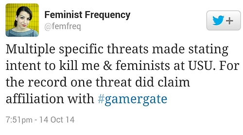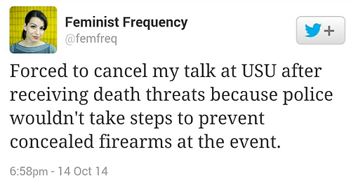 After threats against her life, Anita Sarkeesian canceled an upcoming talk at Utah State University. Gamergate trolls are celebrating on Twitter while simultaneously dismissing the threats as nothing. Does this read like nothing to you?