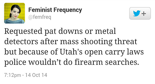 The email’s author threatened to murder feminist women indiscriminately in a mass shooting. And because carrying guns on campus outweigh the right of students and guests to be safe, Anita Sarkeesian canceled her talk.