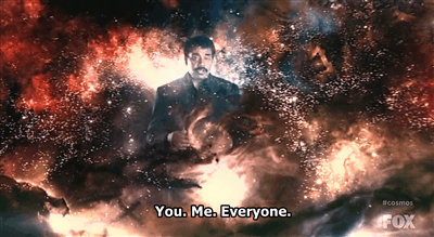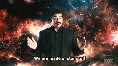 They get so hot that the nuclei of the atoms fuse together deep within them to make the oxygen we breathe. The carbon in our muscles, the calcium in our bones, the iron in our blood, all was cooked in the fiery hearts of long-vanished stars.