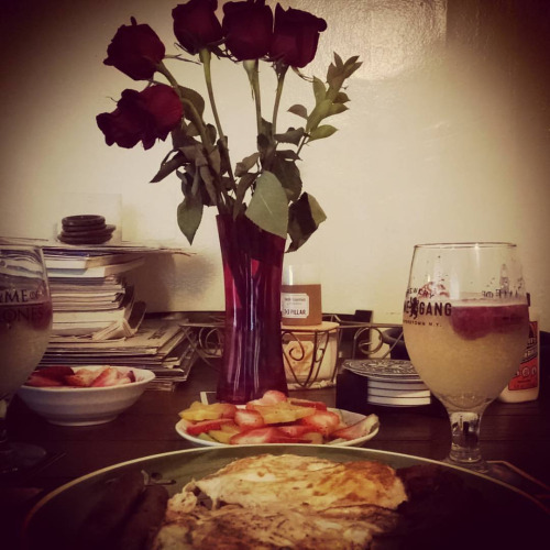 Moscato, raspberries, fruit, bacon, eggs, everything. Best breakfast is best. My love made the food, I’ll do the dishes. Happy Valentine’s Day.