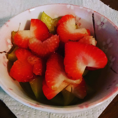 Strawberry hearts and starfruits and kiwi on the bottom. I love...