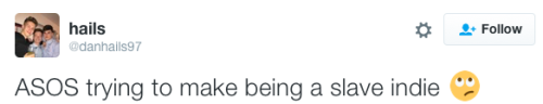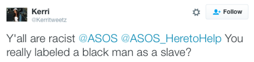 Did no one at ASOS or brand Wasted Heroes stop and think, “Maybe we shouldn’t have a black man wear a shirt that says slave?” Or even, “Maybe we shouldn’t have a shirt that says slave?” At least Wasted Heroes realized how ignorant this is.