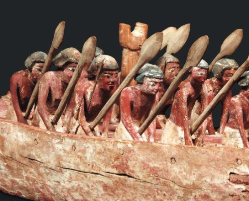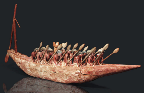 Large Egyptian Boat Model and Crew, Middle Kingdom, Dynasty XI-XII, C. 2134-1782 BCMade of wooden polychrome stucco, this large and exceptional boat model, accompanied by its crew, is a perfect illustration of grave goods dating from the First Intermediate Period and Middle Kingdom. These models appear as early as the sixth dynasty (c. 2350 BC) and have the same meaning as the scenes carved on the walls of the tombs of the Old Kingdom with the aim to provide for the deceased in his or her afterlife. At nearly 60 inches long, this particular model is one of the largest known boats in existence.