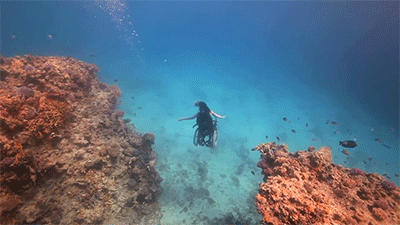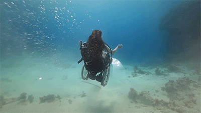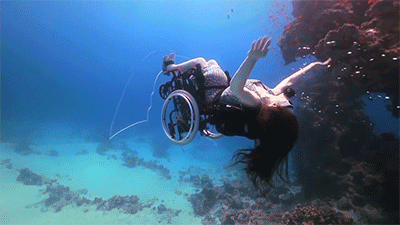 Oh my god, she’s just swimming along in her awesome aquatic wheelchair not giving a shit. This lady rules!