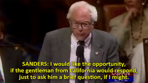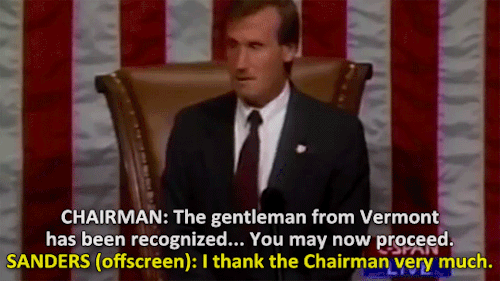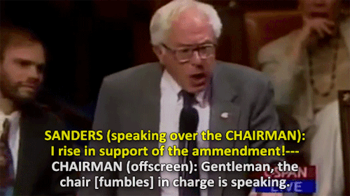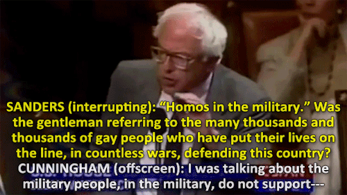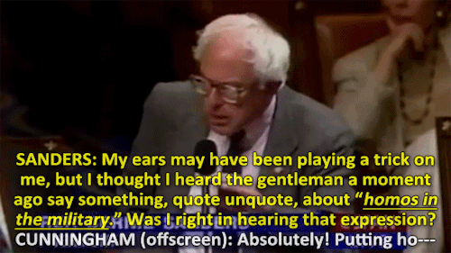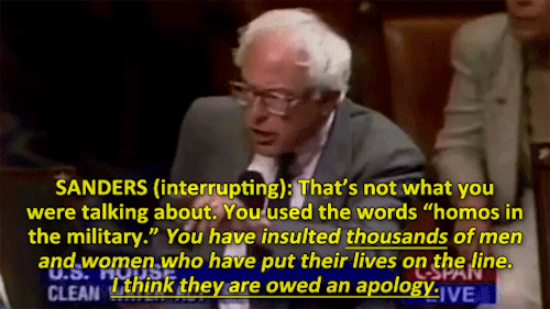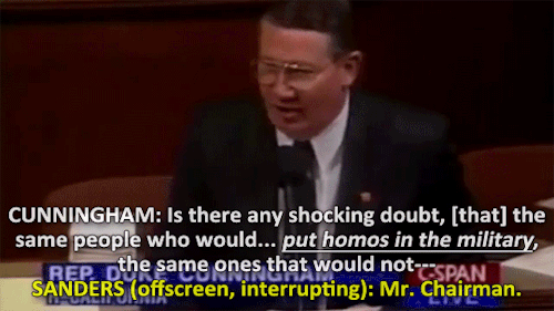 The year is 1995, congress member Bernie Sanders stands in opposition of a homophobic statement said by Duke Cunningham. Cunningham derisively refers to “homos in the military” to support his argument while (strangely) discussing the Clean Water Act. Sanders, having none of it, quickly rises to the defense of thousands of men and women everywhere. Sanders ire is such that he repeatedly disrespects the Chairman by speaking over him in order to say his piece. [Video Source]
