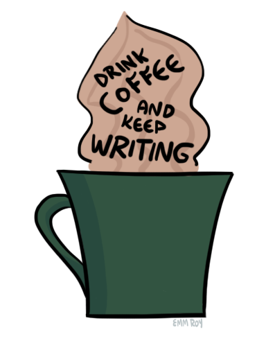 [image description: drawing of a green cup of coffee with a caption that says “Drink coffee and keep writing.” written in the steam on top of the coffee.]