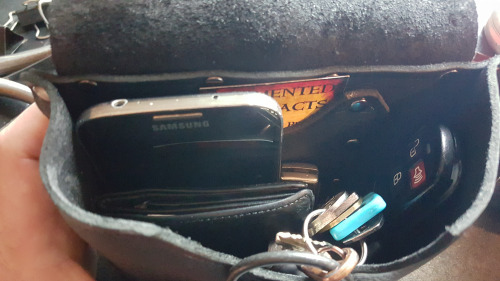 Here's an idea of how much stuff this can hold- wallet, phone, big keyring, utility knife, and there's a slip for cash/cards