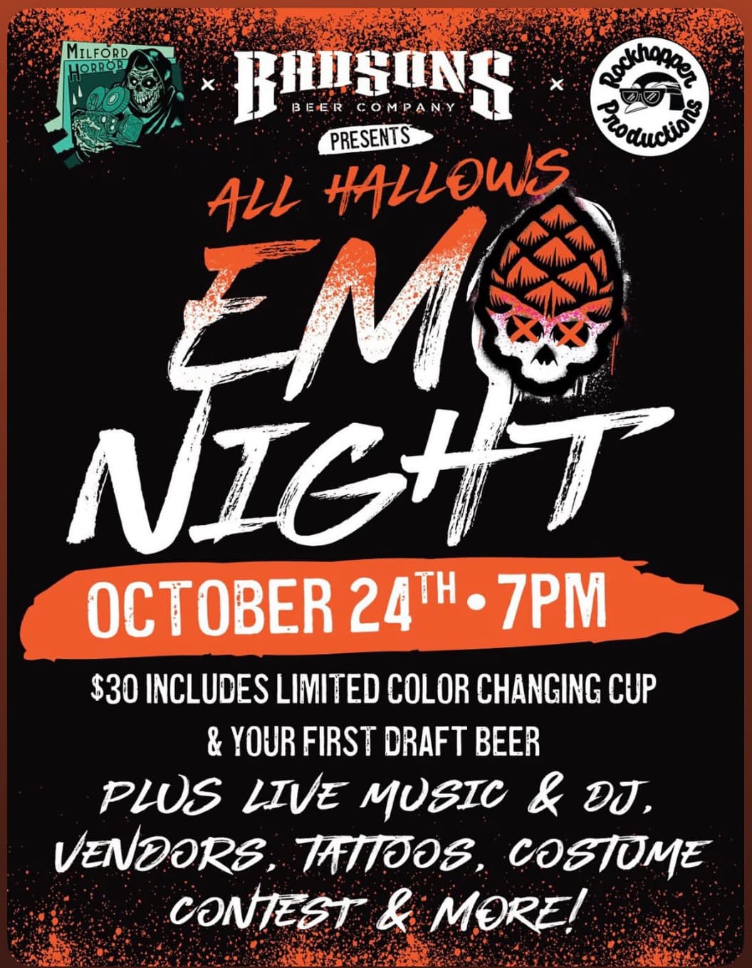 TONIGHT ONLY! October 24, 7–9, All-Hallows Emo Night, Badsons Beer Co., 251 Roosevelt Dr., Derby CT (tickets here)!
