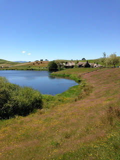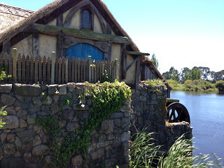Here's a hobbit garden with scarecrow. Below you can see the pathway by the large lake that leads to the Green Dragon Inn. I couldn't get enough of the little chimneys that dotted the green hills.
