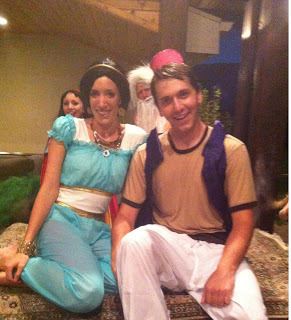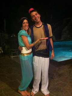 My husband and I dressed up as Jasmine and Aladdin. Little side note: I made his costume, and it looked great--before he jumped into the water (he performed the scene from Aladdin where the soldiers chase him. In part of the song it says: "I'll I gotta do is--JUMP!" He, of course, jumped into the water for his dramatic exit).