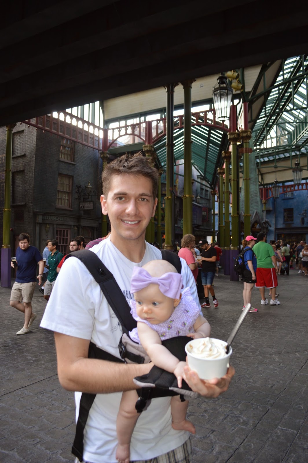 My baby trying to eat Butterbeer ice cream, which was way too good to share with her.