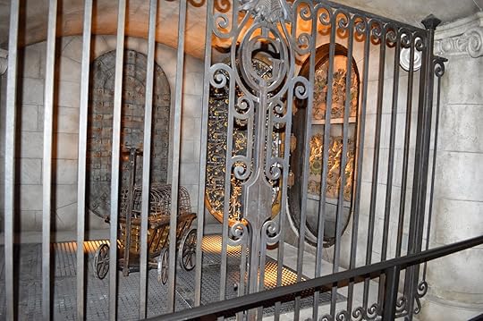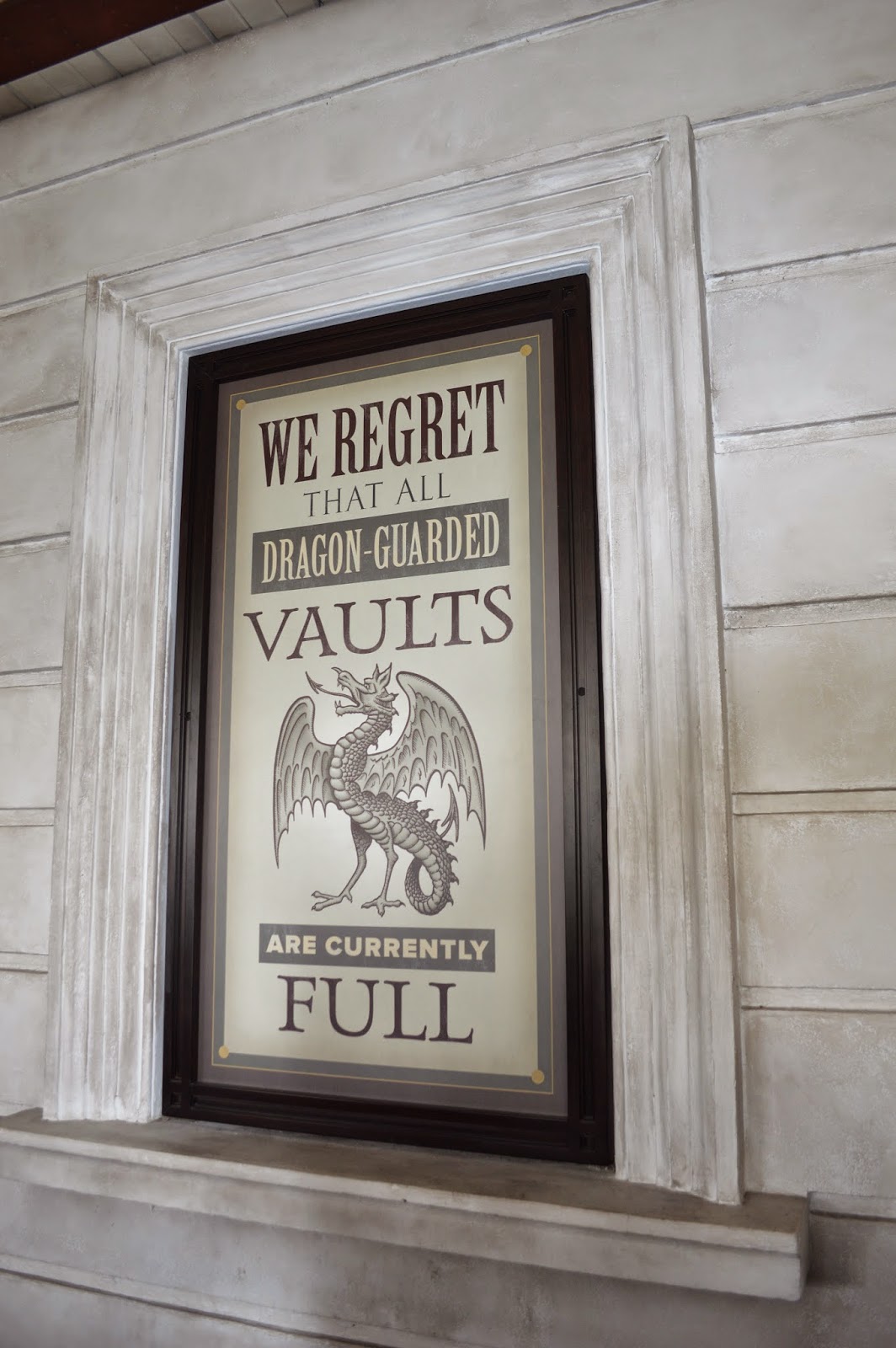 The queue line for the Escape from Gringotts ride with plenty of glaring goblins.