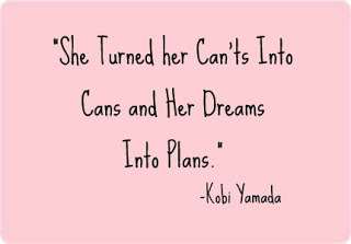 Sometimes you see a quote that just resonates inside of you. Today I came across this quote and fell completely in love with it. "She turned her cant's into cans and her dreams into plans." It's so simple, but it means so much to me. I haven't always done this in my life--in fact I think it's extremely difficult to act on your dreams and carry out goals. So many times I've thought of life plans, dreams, and goals that I wanted to accomplish, but then I got scared. So often I become insecure and convince myself that either the dream is too big, or difficult, or that I'm not good enough. Why? Why is it scary to dream big? Before I got published I hardly told anyone that I was working on a novel. I had so many family and friends that were shocked to find out I was getting published. The common response was, "I didn't even know you were working on a book!" I suppose I was afraid of failure. I didn't want people to feel bad for me if I couldn't get published. But why did I care? Failure is a necessary part of growing and learning, something that I try to always keep in mind. This summer I've started to create some very big goals. Some days I wake up confidently ready to conquer anything. A lot of the time I question myself. Now I want to change that. That's one of my new goals. I don't want to be afraid to dream big. I want to go forward boldly and face fears. I know it will be hard, but it's worth it. I hope you'll join me on this journey. Let's turn our cant's into cans and our dreams into plans!