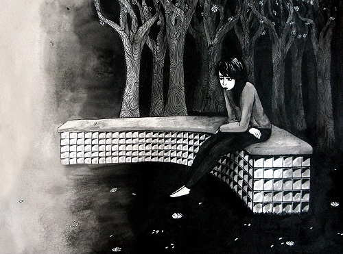Since I had nothing else to do and I was in no hurry to go anywhere, I've tried to escape your sounds and sight, by turning to my inner world, by concentrating on something that wasn't really occupying my mind. But that proved to be impossible, so I've decided to focus all my attention to your face, without seemingly doing so. Of course that was ridiculous since I couldn't look straight at you, and the weak lighting in the park didn't help much either. You seemed to be half-hidden in the shadows, physical and emotional. As you were sitting there, head bowed, I couldn't see your eyes. The only thing that stood out was the flame on your cigarette. But I already knew how you looked. A pale face. Long straight painted-black hair. Not tall nor short. Thin but not too thin. I don't know why but I felt an instant tenderness towards to you, a sympathy that had no real reason to be there since I didn't know you. It was as if a sixth sense of sorts was letting me know that, well, being there was where I was really supposed to be.