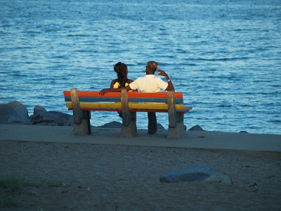 She's maybe smiling as well right now. Maybe. There's no way to say. But one thing is certain; she enjoys being there, abandoned in his almost hug, feeling his body's warmth and gazing at the endless blue of the ocean.