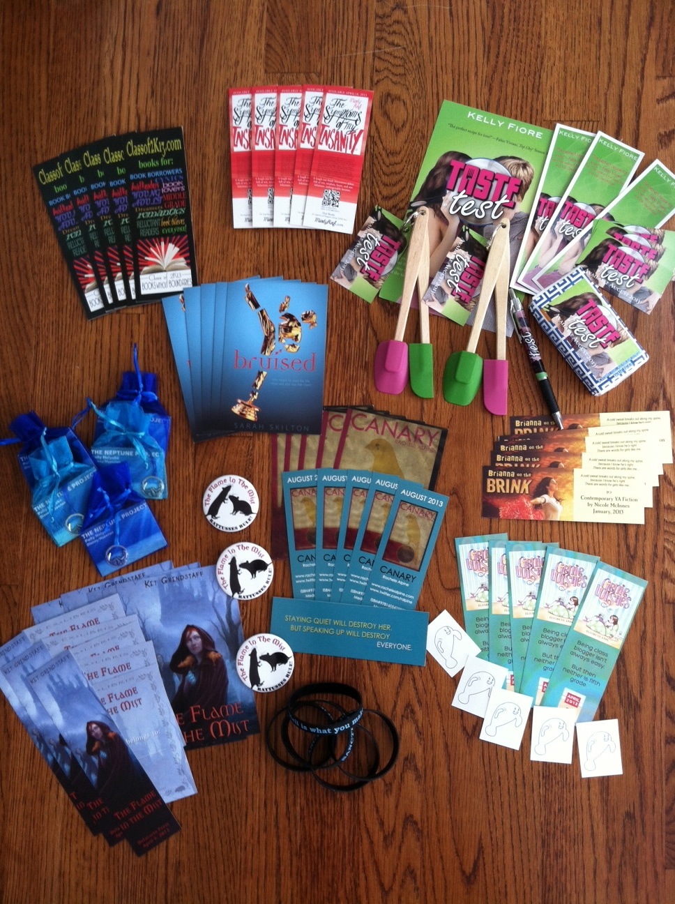 The Class of 2k13 bookmarksTHE SYMPTOMS OF MY INSANITY bookmarks, from Mindy Raf TASTE TEST swag, including mixing spoons, tissues, pen, business cards, bookmarks, and large cards from Kelly FioreMermaid pendants from Polly Holyoke for THE NEPTUNE PROJECTBRUISED postcards from Sarah SkiltonCANARY postcards and bookmarks from Rachele Alpine BRIANNA ON THE BRINK bookmarks from Nicole McInnesTHE FLAME IN THE MIST bookmarks, bookplates, postcards and buttons from Kit GrindstaffSANCTUM bracelets (they read "Hell is what you make of it.") from Sarah Fine GENIE WISHES bookmarks and manatee temporary tattoos from Elisabeth Dahl