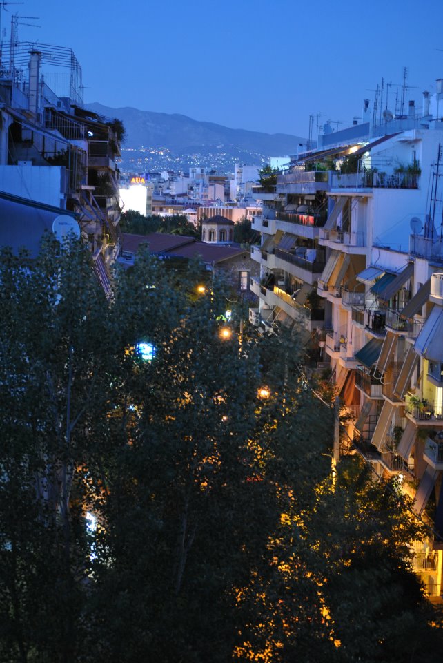 Make us a little jealous of your new hometown, Greece. (what you had for breakfast, a view, etc.)Well, it's not really new. I've been here for eleven years! What did I have for breakfast? Thick Greek yogurt with banana and honey, on my balcony in 20 degree Celcius heat (It's supposed to be winter). I'm six stories high, and today the air was so crisp, and the sun just the right heat to sit in. Bliss. My view isn't too bad either. Though I'm in the center of town, I have mountain views!