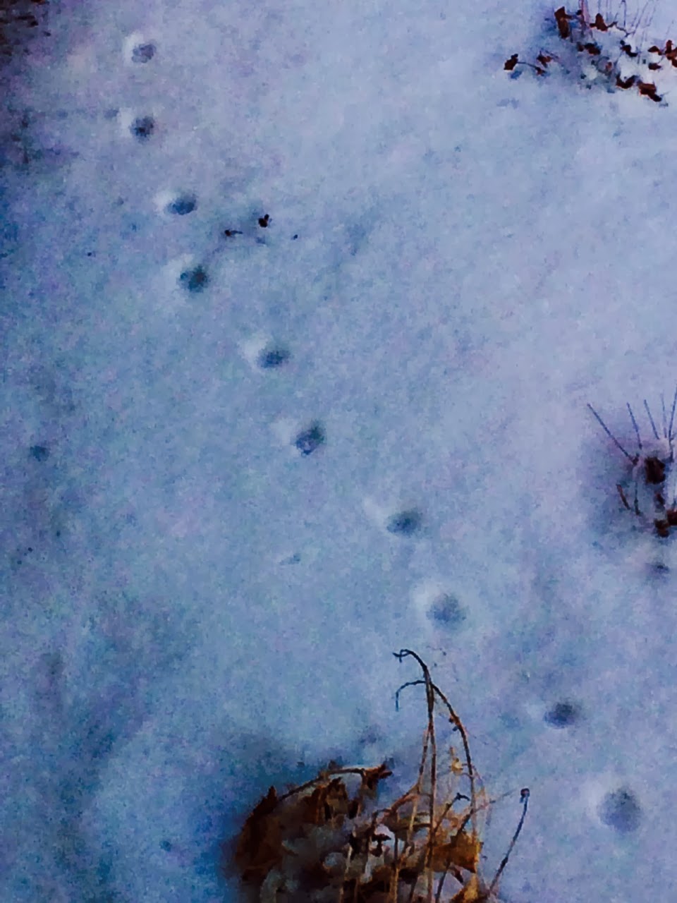 Usually, the prints show things like tail markings, or claw prints, or stuff like that. I can tell you that these are about 2 inches across, with a 7 inch stride. No tail markings. No long paw prints, like we see with the cottontail rabbits. It's too big to be a squirrel, and it's no four legged creature either, like a cat or dog or raccoon (usually you see the grouped front and back paw prints.) And they don't seem to be turkey prints, since they usually leave telltale three-toed marks.