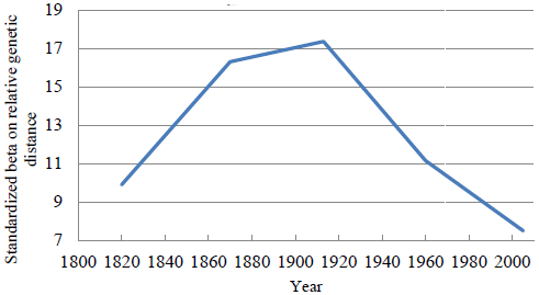 Figure 1. Standardised effect of genetic distance over time, 1820-2005