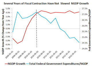 This first figure shows that aggregate demand growth has not been affected by a tightening of fiscal policy since 2010. Specifically, it shows that nominal GDP (NGDP) growth has been remarkably stable since about mid-2010 despite a contraction in federal government expenditures.