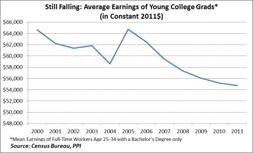 Real earnings for young college grads have fallen by over 15% since 2000, or by about $10,000 in 2011 dollars