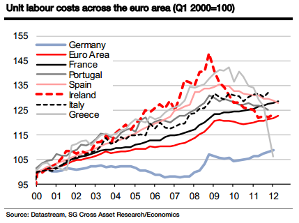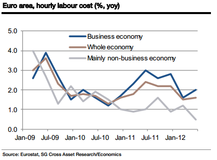 SocGen’s Michel Martinez writes that there are outright wage declines in Greece while in the other peripherals, labour productivity (as measured by ULC) is outpacing wage gains.
