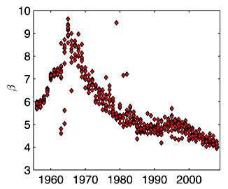 Smaller values of β indicate less timbral variety: frequent codewords become more frequent, and infrequent ones become even less frequent. This evidences a growing homogenization of the global timbral palette. It also points towards a progressive tendency to follow more fashionable, mainstream sonorities.