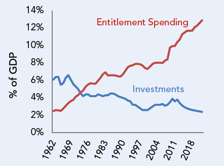 Entitlements are squeezing out public investments. In 1962, spending on investments was two and a half times that of entitlements. But today, as a result of this Great Inversion, entitlement spending is three times that of investments. And this trend will only accelerate in time as the Baby Boomers retire and their benefits grow faster than inflation and wages.