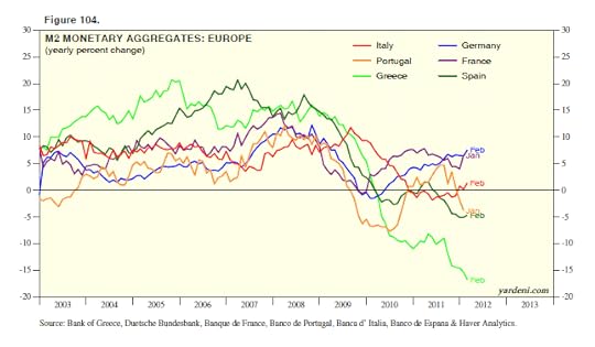 Germany’s M2 is up 7.5% y/y through February. Some of that growth is coming from Greece, Portugal, and Spain, where money supplies are falling as depositors move their funds to banks they deem to be safer in Germany.