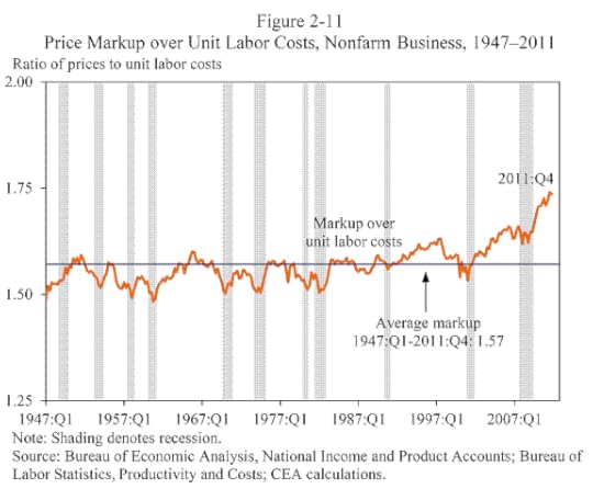 My view is "sticky nominal wages for some, negative AD shock, ongoing stagnation and thus low job creation, and the progress we have is in some sectors immense but typically labor-saving rather than job-creating, all topped off with a liquidity shock-induced revelation that two percent of the previous work force was ZMP." (Try screaming that from the rooftops.) I read the above graph as consistent with that mixed and moderate view. As Arnold notes, it's harder to square with an AD-only view. If I wanted to push back a bit on Arnold's take, and save some room for AD stories, I would cite the "Apple Fact of the Day," and also note that stock prices have not responded nearly as well as have measured corporate profits. Still, we economists are not taking this graph seriously enough.